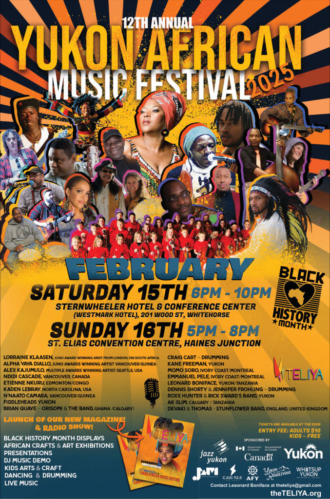 TELIYA International Society prepared the annual Yukon African Music Festival. For 2023 the event was hosted at Mount McIntyre Recreation Centre in Whitehorse, and at the Haa Shagóon Hidi Hall in Carcoss. Live music, presentations, workshops, DJ music demo, kids art & craft, drumming, and dancing was usher to the attendees by Bazooka (Congo/France), Jessica